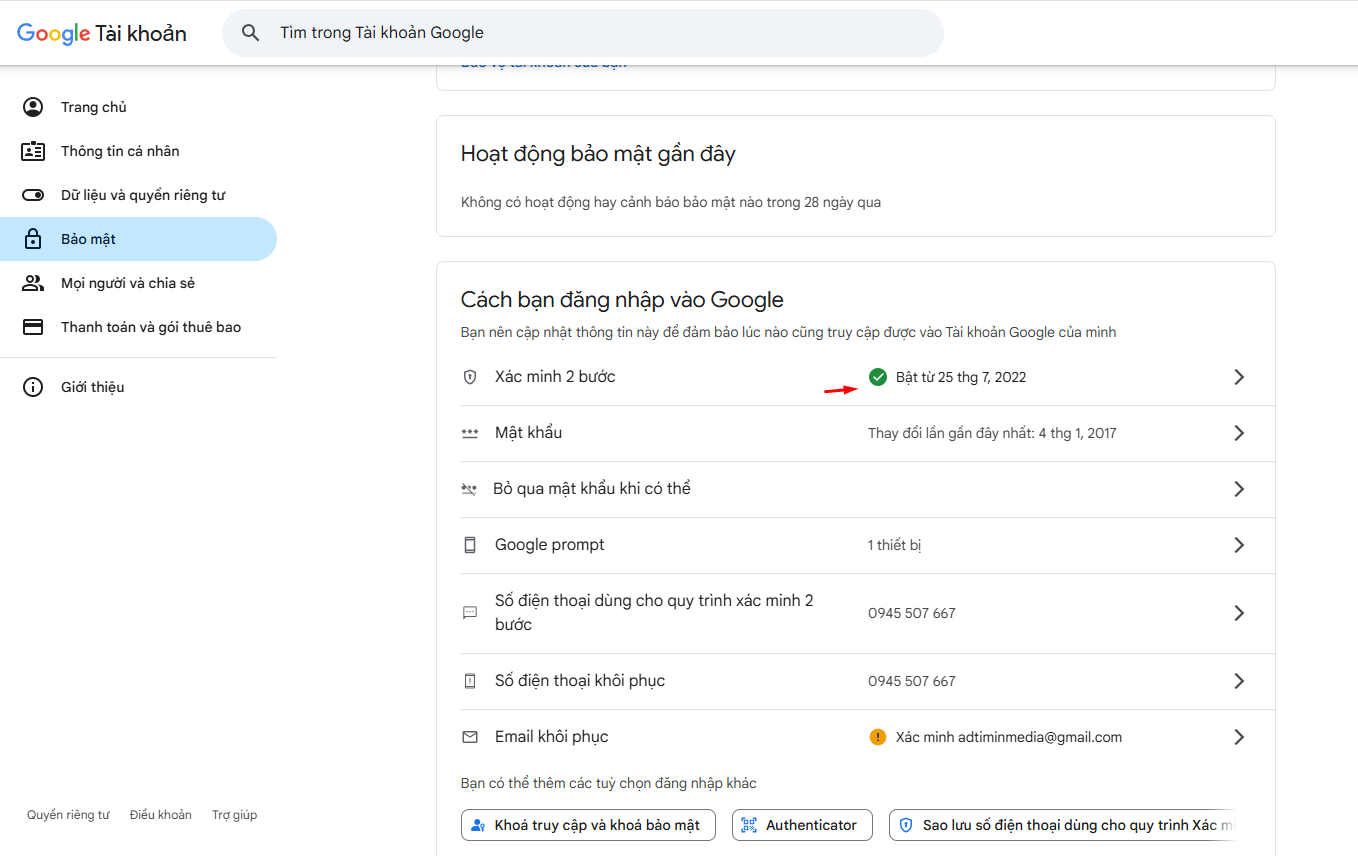 Nếu bạn nào bật xác minh 2 bước rồi có thể bỏ qua phần này (Để sang tiếp phần sau: Cách tạo mật khẩu ứng dụng).