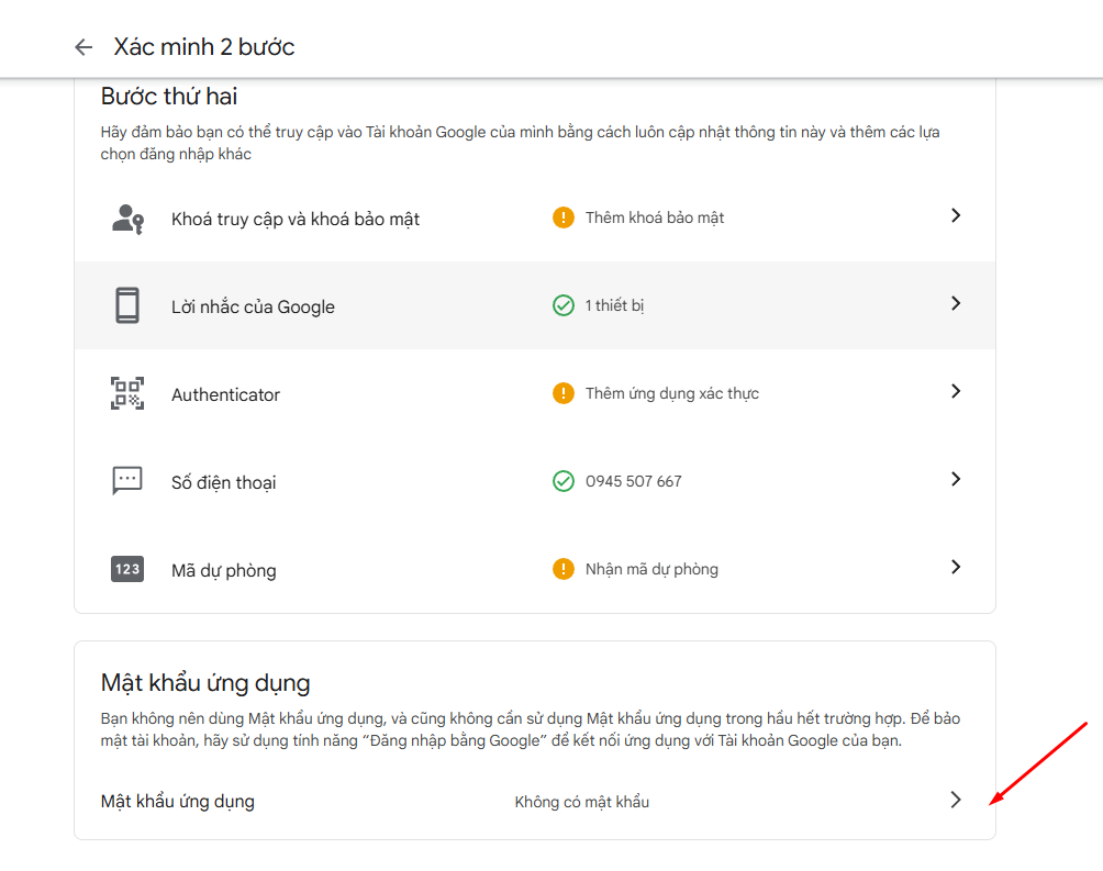 Mật khẩu ứng dụng là một mật mã gồm 16 chữ số cung cấp cho ứng dụng hoặc thiết bị quyền truy cập Tài khoản Google của bạn. Với mỗi mật khẩu ứng dụng bạn chỉ được dùng cho 1 ứng dụng, không thể dùng cho ứng dụng thứ 2. Vì thế bạn không cần nhớ mật khẩu ứng dụng. Mất thì tạo mới ?